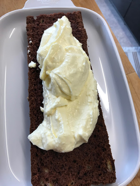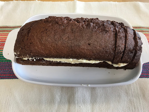 Refrigerar, si es que te dejan! :_) Servir cortado en lonchas hermosas. ¿Cuándo? Desayuno, merienda, y definitivamente podríamos incluirlo sí o sí en la lista de los Kaffee&Kuchen. Para hacerlo más espectacular podemos disponer sobre el frosting rodajas de plátano y fresas...