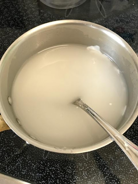 Ponemos a calentar el agua y 2 c. s. azúcar, más el contenido del sobre de Tortenguss. Llevamos a ebullición. Apartamos y esperamos unos minutos a que pierda calor.