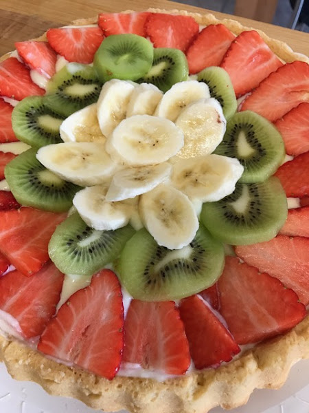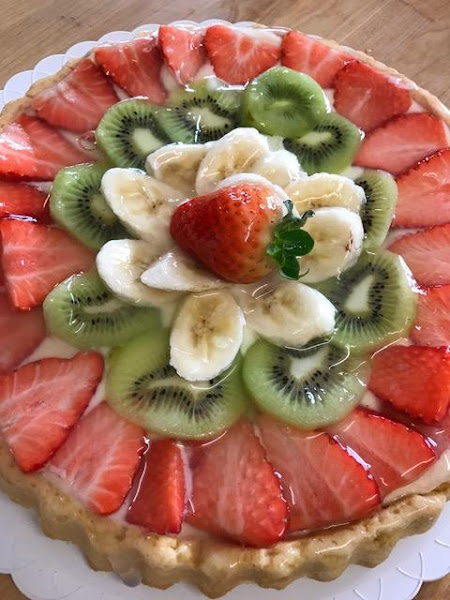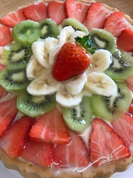 Corta la fruta o abre una lata de macedonia (o cualquier fruta que te guste) en almíbar... Pon el pudin frío sobre la base; luego distribuye la fruta, bien escurrida si es de bote, para que quede bonita. Prepara en el momento el glaseado con un sobre de Tortenguss (esto no es negociable) siguiendo las instrucciones del sobre, y repártelo sobre la fruta, asegurándote de que queda bien cubierta. No hay que ponerlo todo... solo el necesario. Si no te gusta te lo puedes saltar. La tarta no quedará mal, solo menos resultona. Refrigerar al menos 2 horas. ¡Ale! ¡A comer!