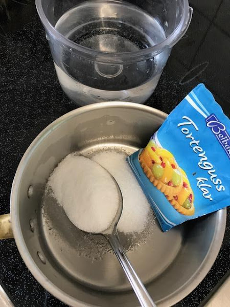 - 1 sobre de glaseado para pasteles de frutas claro (Tortenguss Klar), con 250 ml de agua y 2 c.s. azúcar