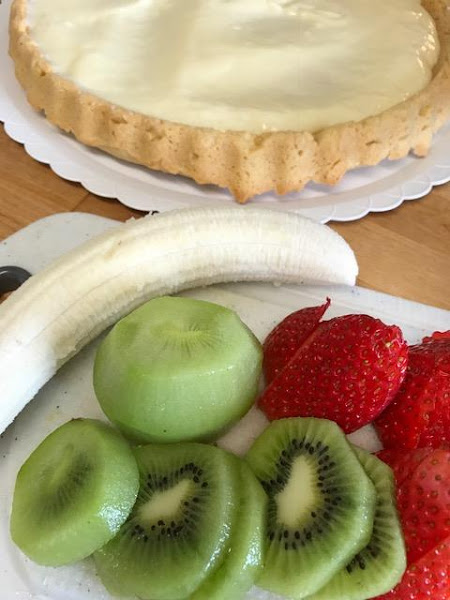 Tendremos ambas preparadas en la mesa de trabajo, junto con la fruta lavada, que iremos cortando en función de lo que nos haga falta (así no tiramos). Cubriremos la base con la crema, evitando que se desborde, dejando un poco de espacio para la fruta.