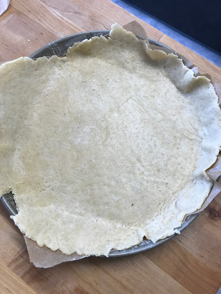 Antes de estirarla, corto un papel vegetal del tamaño del molde que he elegido (preferiblemente, uno para pasteles de frutas de paredes bajas). Estiro la masa con el rodillo sobre dicho papel, procurando que me quede lo más ajustada posible a sus dimensiones. Si se pega un poco, para evitar agregar mucha harina, podemos utilizar un segundo papel vegetal sobre la masa, y seguimos estirando sin problema.