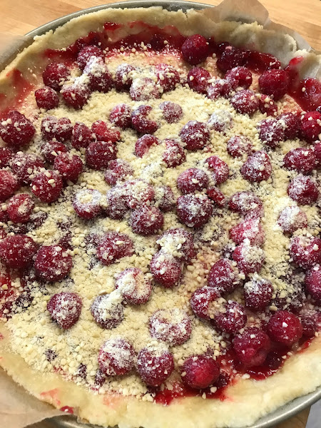 Una Wähe (que se pronuncia /beiiie/) puede ser dulce o salada. En cualquier caso se designa por el nombre del ingrediente principal. Si es de queso será Käsewähe; si es de fruta pues por el nombre de la fruta que hayas elegido; como es el caso de hoy, Himbeerwähe, tarta de frambuesas.