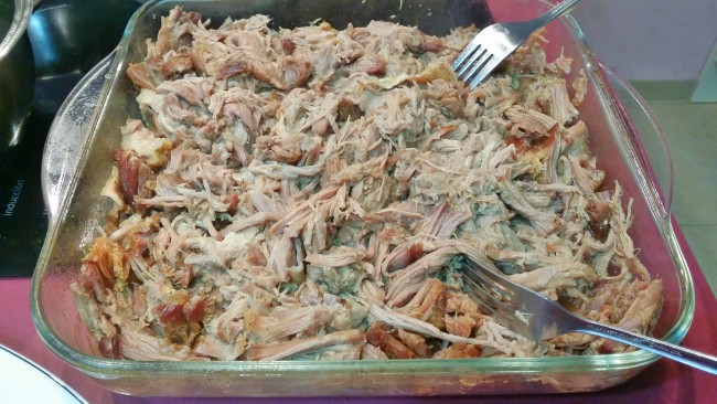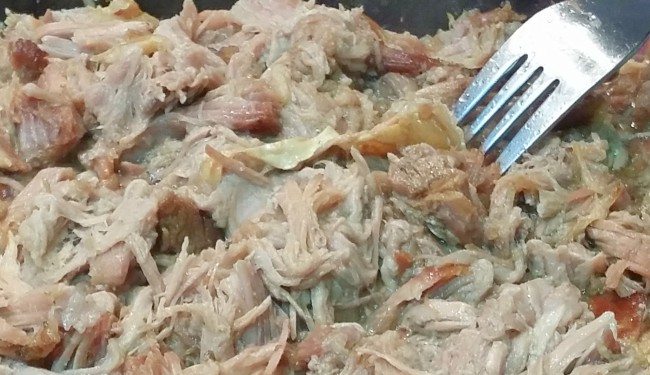 Retire la carne de la olla de cocción lenta, o del horno y desgarra la carne con dos tenedores, agregando goteos de la salsa que haya ido dejando según sea necesario para humedecer.