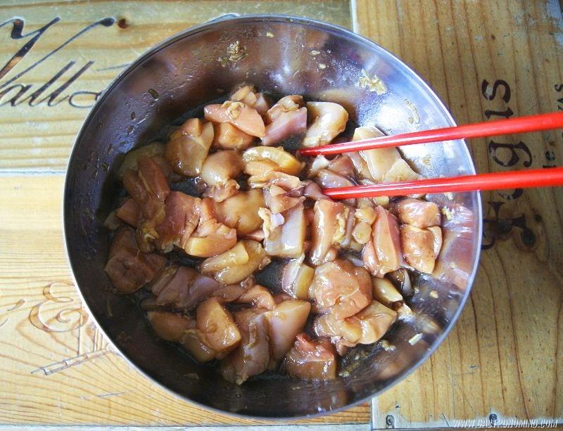 Quitamos posibles excesos de grasa del pollo y cortamos en cubos de 11/2 centímetros aproximadamente, colocamos en un bol o bolsa Ziploc y tapamos o cerramos según sea.