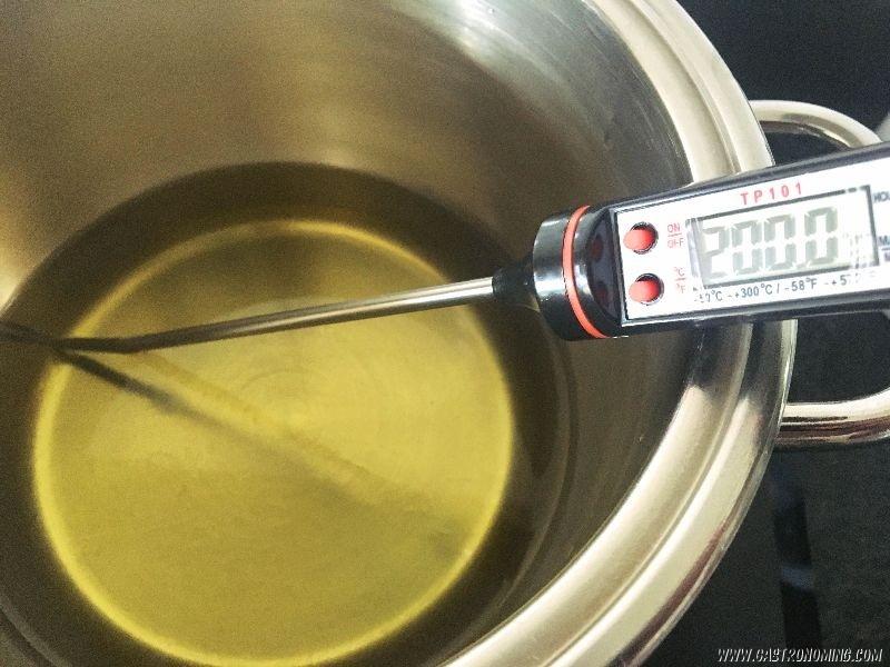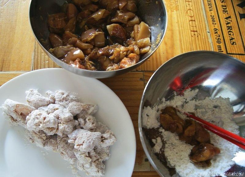 3. Mientras calentamos el aceite a unos 180-200 ºC. vamos a pasar los trozos de pollo escurridos del marinado por la fécula de patata uno a uno recubriendo bien por todos sus lados y vamos friendo hasta dorar.