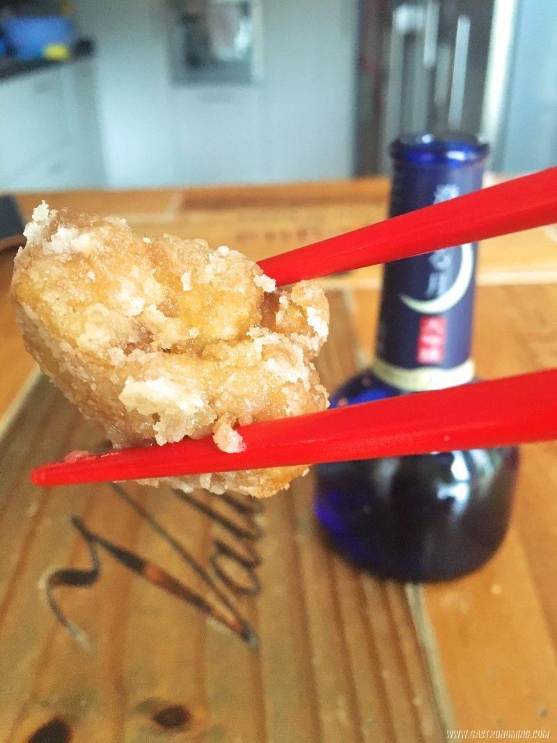 En ocasiones, hay quienes hacen la técnica de la doble fritura para hacer Karaage, primero se fríe con aceite a una temperatura de 90ºC. Se retira, se deja enfriar y se vuelve a freír a 200ºC. rápidamente para un crujiente mayor, no lo considero necesario ya que la fécula de patata lo deja crujiente de por sí, además, como son trozos muy pequeños y es pollo, muchas veces se puede sobre cocinar y secar. La fécula de patata o Katakuriko es un ingrediente fundamental, yo la prefiero por encima de cualquier otra cobertura, hay quienes la mezclan con un poco de harina común o incluso hacen una mezcla de 50%-50% y si no tienen esta fécula usan Maizena o fécula de maíz, no es igual, pero casi, ni modo, si no cuentas con la fécula de patata, ya podrás apañarte con una u otra, ¿No? Ahora bien, si no encuentras sake para cocina, bien podrías usar un vermú blanco o un vino blanco si no tienes otra opción y ahora que ningún japonés nos escucha, prueba mezclar la fécula de patata con algo de curry en polvo y a morir del gusto.