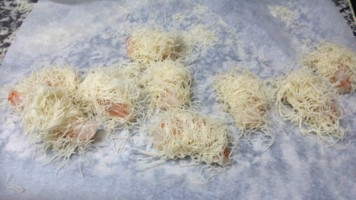 Abrimos la pasta kataifi, separamos unas hebras y enroscamos alrededor de los gambones. Aplastaremos con la mano para ayudar a que se peguen.