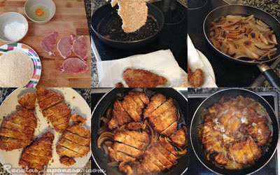6. Bate los huevos en un tazón. Hierve la sopa y vierte los huevos sobre el tonkatsu y la cebolla.