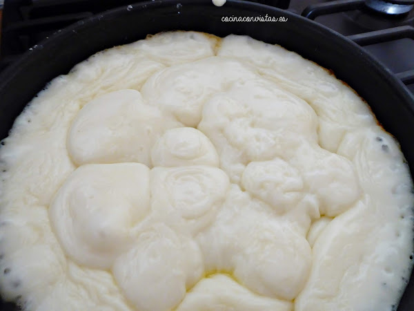 El pudin empezará a burbujear y se irá cocinando un poco más. Una vez dorado el fondo, pasamos la fuente de Pyrex o sartén a una bandeja con agua, hasta que adquiera temperatura ambiente. Refrigerar 6- 8 horas antes de servir.