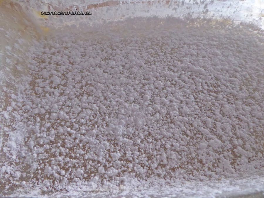Cubrir el fondo de una fuente de Pyrex (o sartén antiadherente) con mantequilla y espolvoreamos el azúcar glas por todos los lados.