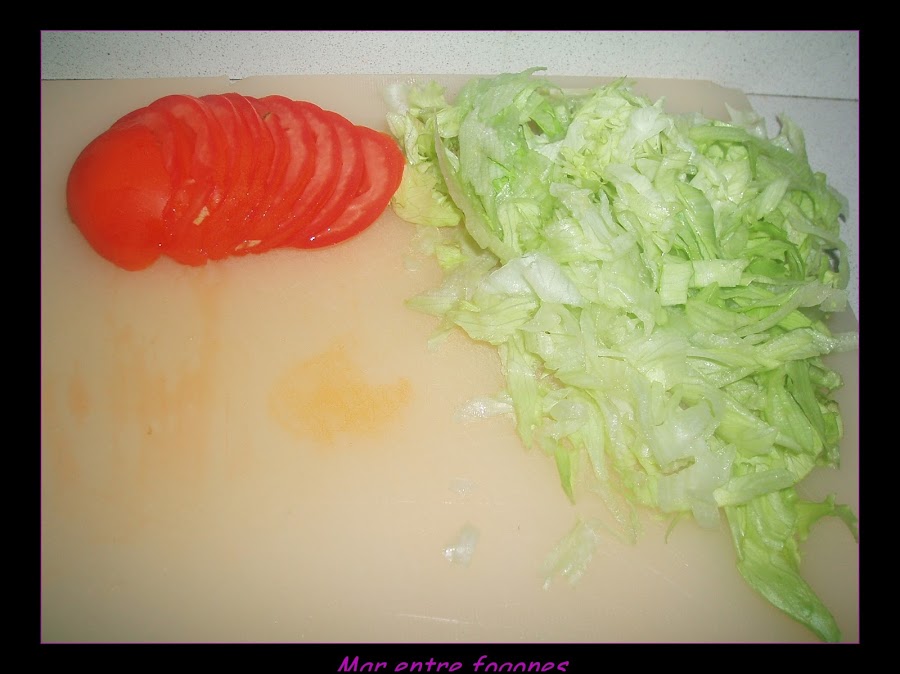 Partimos la lechuga en juliana y el tomate en rodajas.