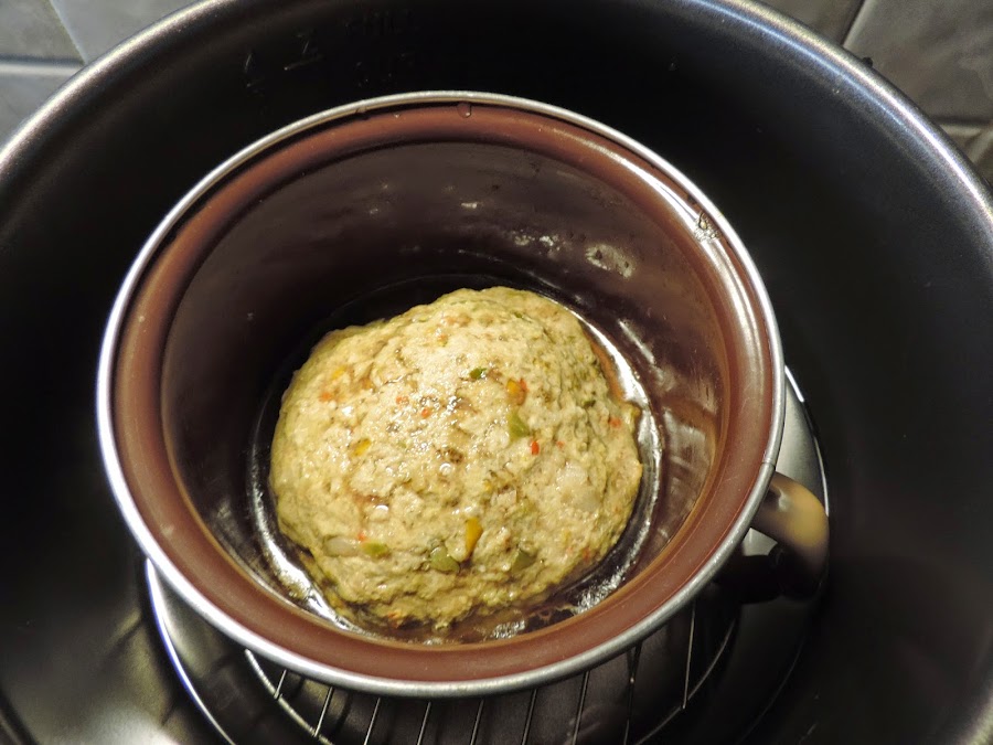 Ponemos la rejilla en la cubeta de la olla, metemos el recipiente con la mezcla y añadimos agua hasta que cubra la mitad del recipiente.