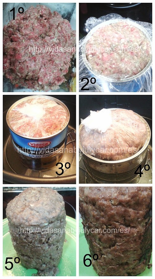En un bol mezclamos las carnes, triturar la cebolla, los ajos, los panecillos, el comino, la sal con la batidora yo con la mycook,, mezclar con la carne y amasar muy bien, para que se integren todo, dejar reposar en la nevera unas 5h o toda la noche ( yo 5h). Pasado ese tiempo, ponemos dentro de la lata la bolsa de asar ó film transparente( yo film transparente no tenia bolsa de asar) vamos introduciendo la carne reservada y aplastando, así hasta llenar todo el bote, anudar el sobrante del film ó atar la bolsa de asar, en la cubeta de la GM E ó GM D, encima ponemos la lata y añadimos agua hasta la mitad de la lata, tapamos con válvula cerrada, menú horno 140º, 30 minutos, cuando termine, apagamos y dejamos despresurizar sola. Sacamos el bote, le damos la vuelta y saldrá el kebab ya cocinado, ahora secamos la cubeta, menú horno y doramos la carne por todos los lados. Lista para comer