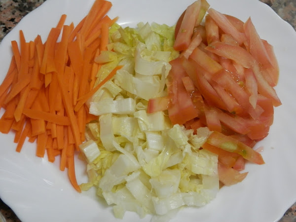 Cortamos y picamos en bastones las zanahorias y el tomate.