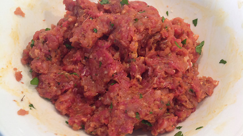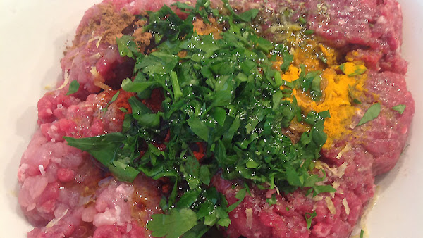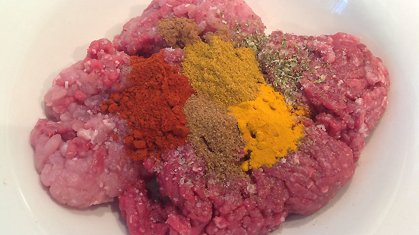 La carne con las especias utilizadas: orégano, pimentón, ras el hanout, cúrcuma, canela, comino.