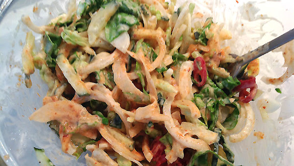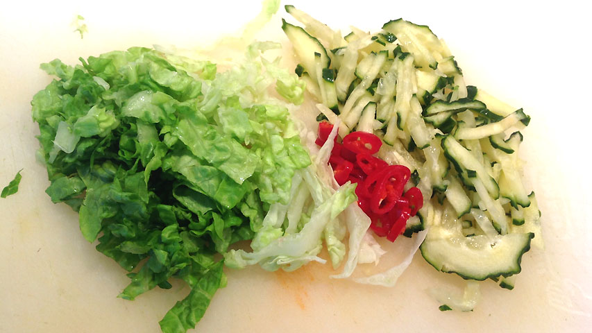 Corta en tiras el pepino, la guindilla, la lechuga y la cebolla. Introdúcelo todo en un bol.