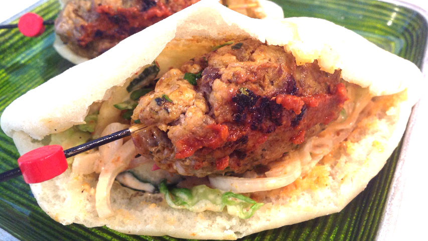 Abre y rellena los panes de pita -AQUÍ RECETA- con la ensalada de guarnición y el kefta untado con una pizca de harissa.