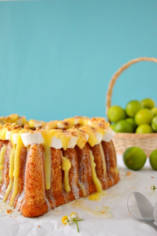 Para hacer nuestro reto, hemos elegido un bundt cake de lima (tan típica aquí en Perú), al que hemos decorado con key lime curd (crema de lima), marshmallows, un glaseado de lima y unas galletas. Una delicia que no podéis dejar de probar. El bizcocho me ha sorprendido porque es extremadamente esponjoso y tiene un sabor a lima estupendo. El contraste de las nubes que están horneadas y se quedan suaves y blanditas con la crema de lima y el bizcocho es espectacular. Vamos allá con la receta que os va a encantar, seguro.