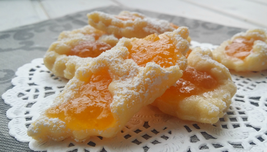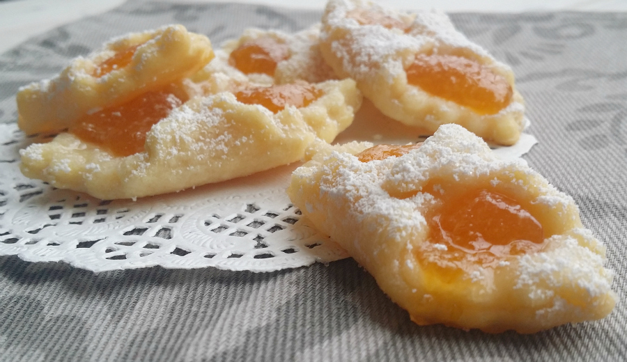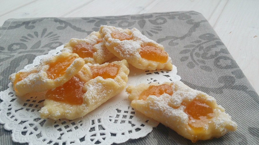 4. Para hacer las galletas, lo mejor es ir tomando porciones de masa y estirarlas primeramente en las manos bien enharinadas, para después ayudarnos con un rodillo. Hay que ir rápido, ya que al perder temperatura la masa se hace más pegajosa. La cortamos con ayuda de un cortapastas cuadrado, le ponemos media cucharadita de mermelada de albaricoque en el centro, y unimos dos de las puntas, tal como se ve en las fotos.