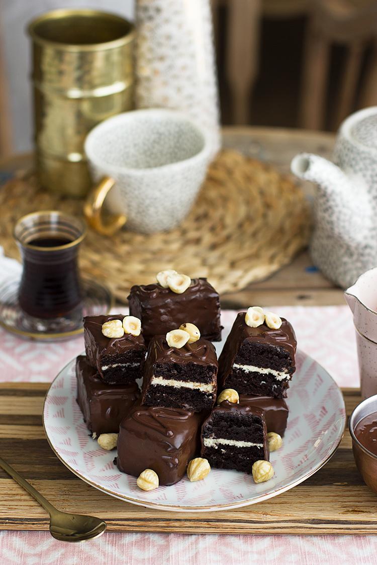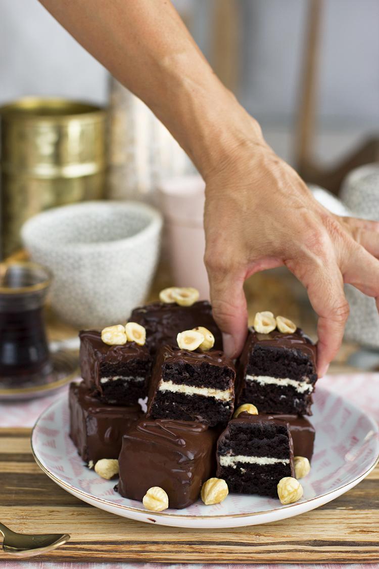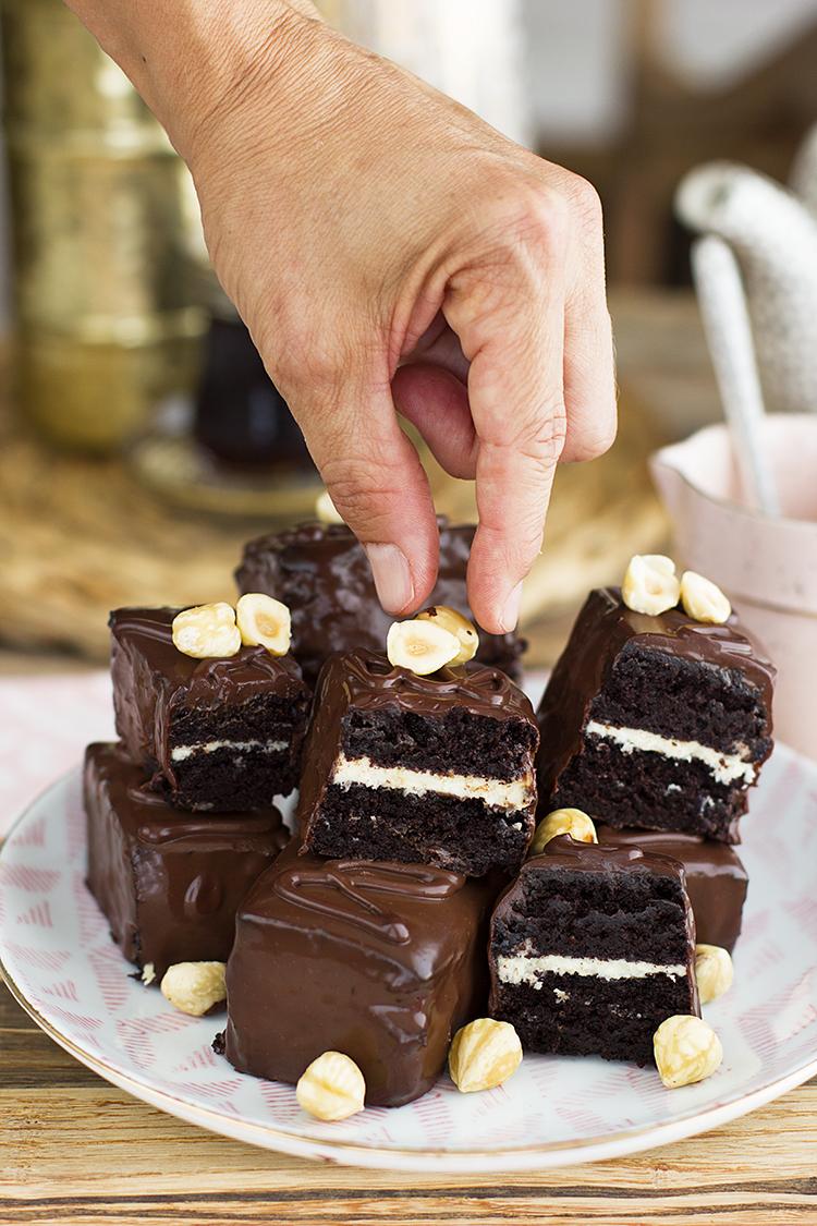 Ponemos los cuadraditos sobre una rejilla enfriadora. No olvides poner abajo un papel de horno o una bandeja para recoger el chocolate que cae en el baño y volver a usarlo.