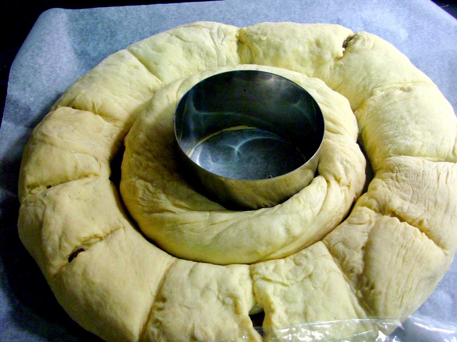 A continuacion estira la masa con un rodillo y forma un rectangulo alargado..coloca el relleno en la parte mas alejada de ti..y enrolla sobre si misma la masa de froma que quede un cilindro ,une los dos extremos para formar el roscon,,pon un aro de cocina en el centro,,y deja levar,,1 hora mas...