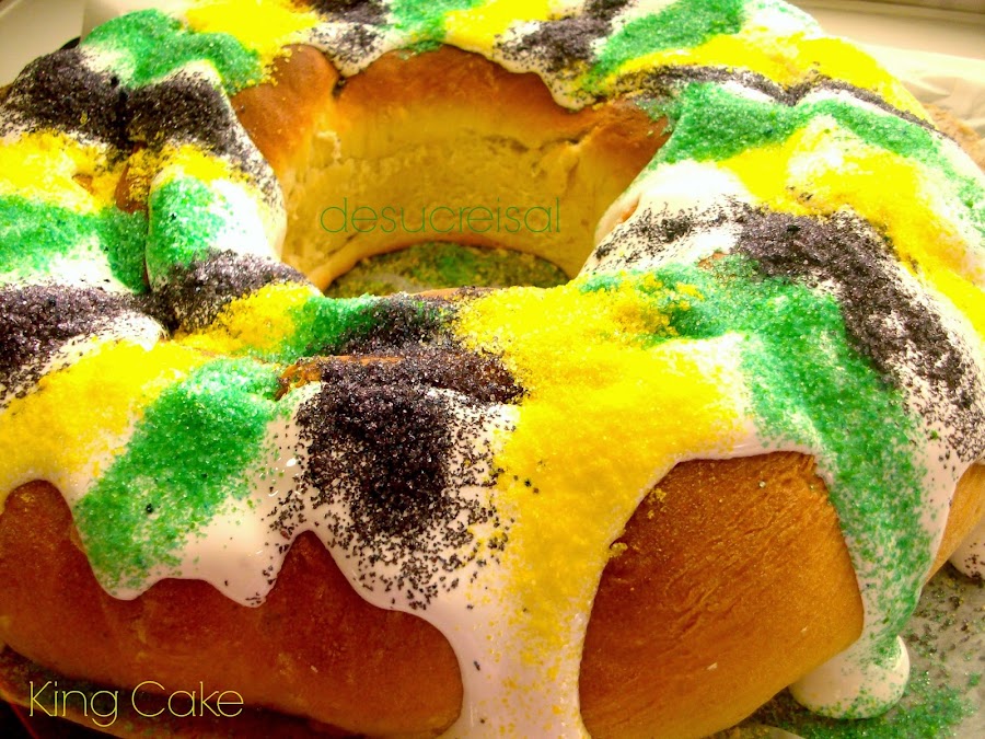 El king cake es tradicional en Lousiana,y se come en época de carnaval y al igual que nosotros escondemos al rey ,ellos esconden un bebe simulando al niño Jesús,y el que lo encuentra paga el roscón al año siguiente..