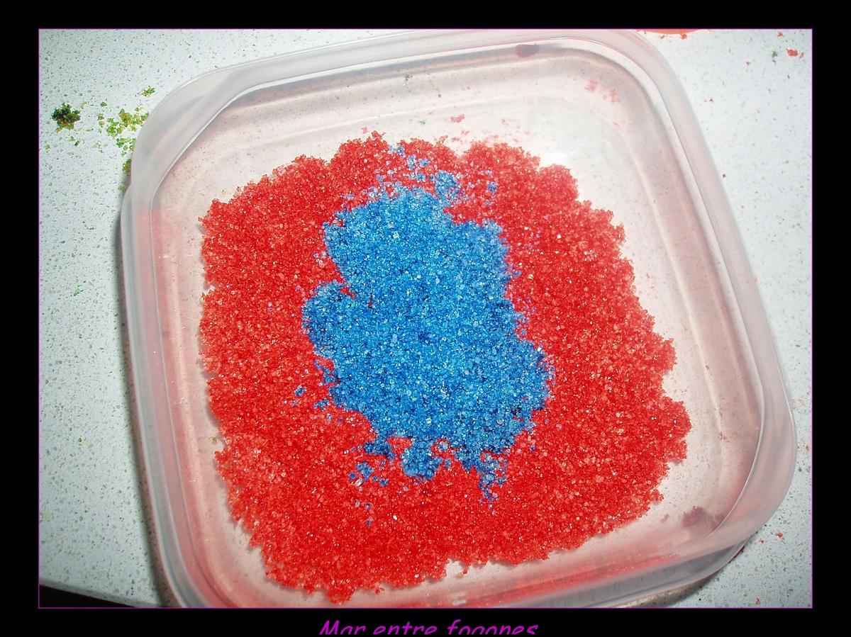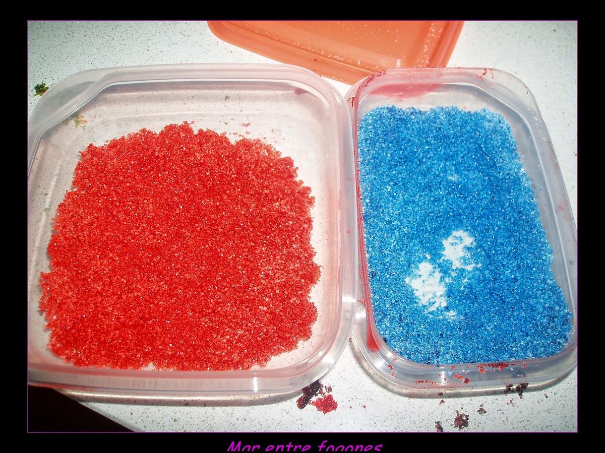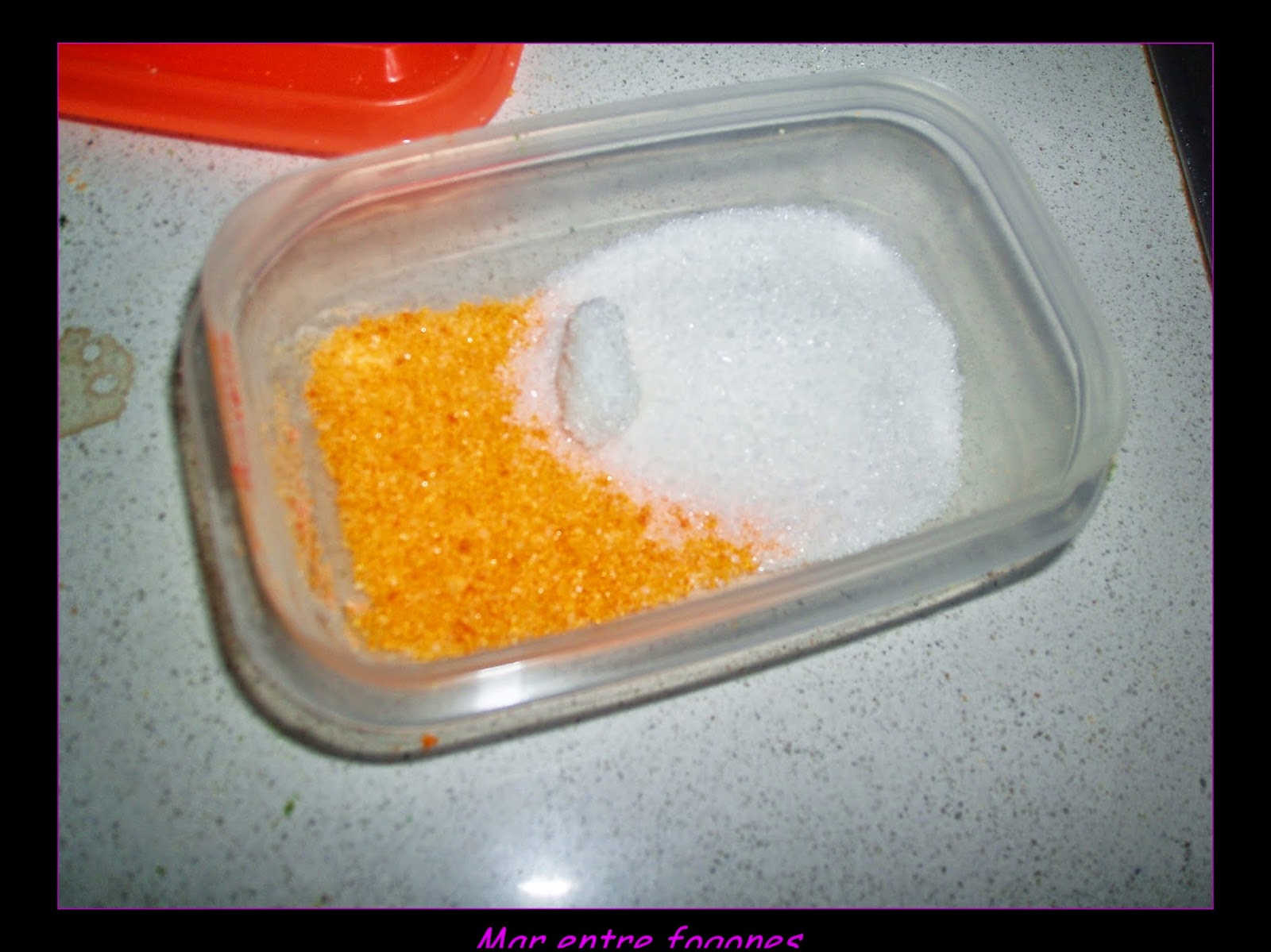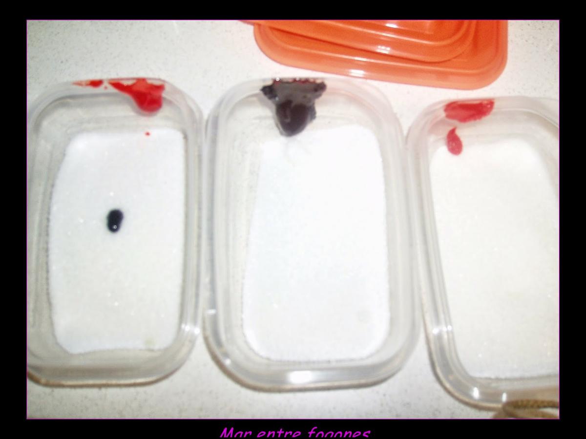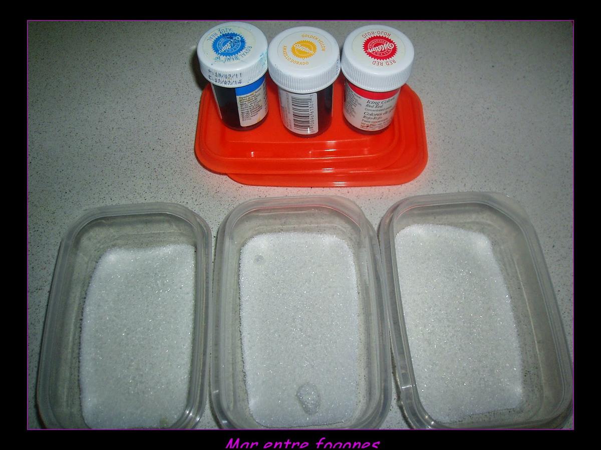 Puse azúcar en un tuper pequeñito, y un poco de colorante en cada tuper de cada color. Rojo, azul y amarillo.
