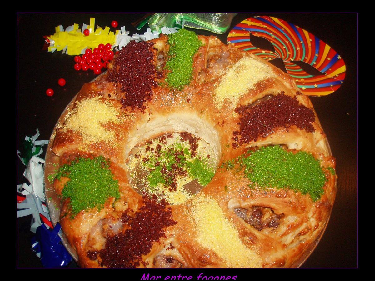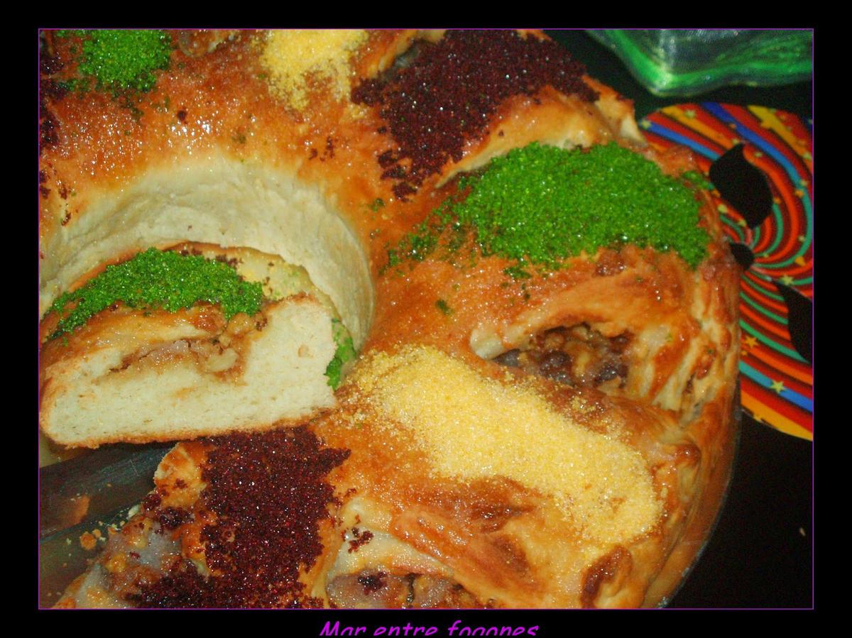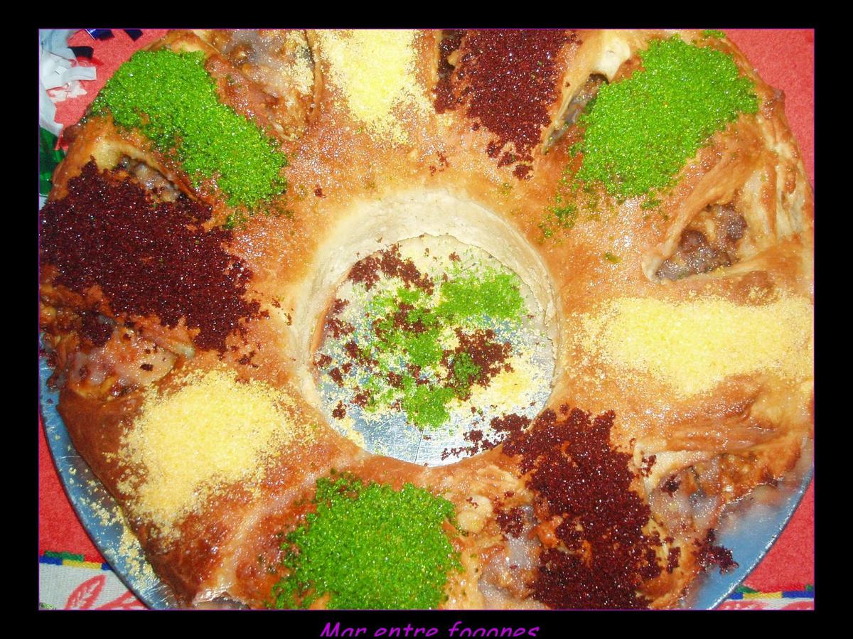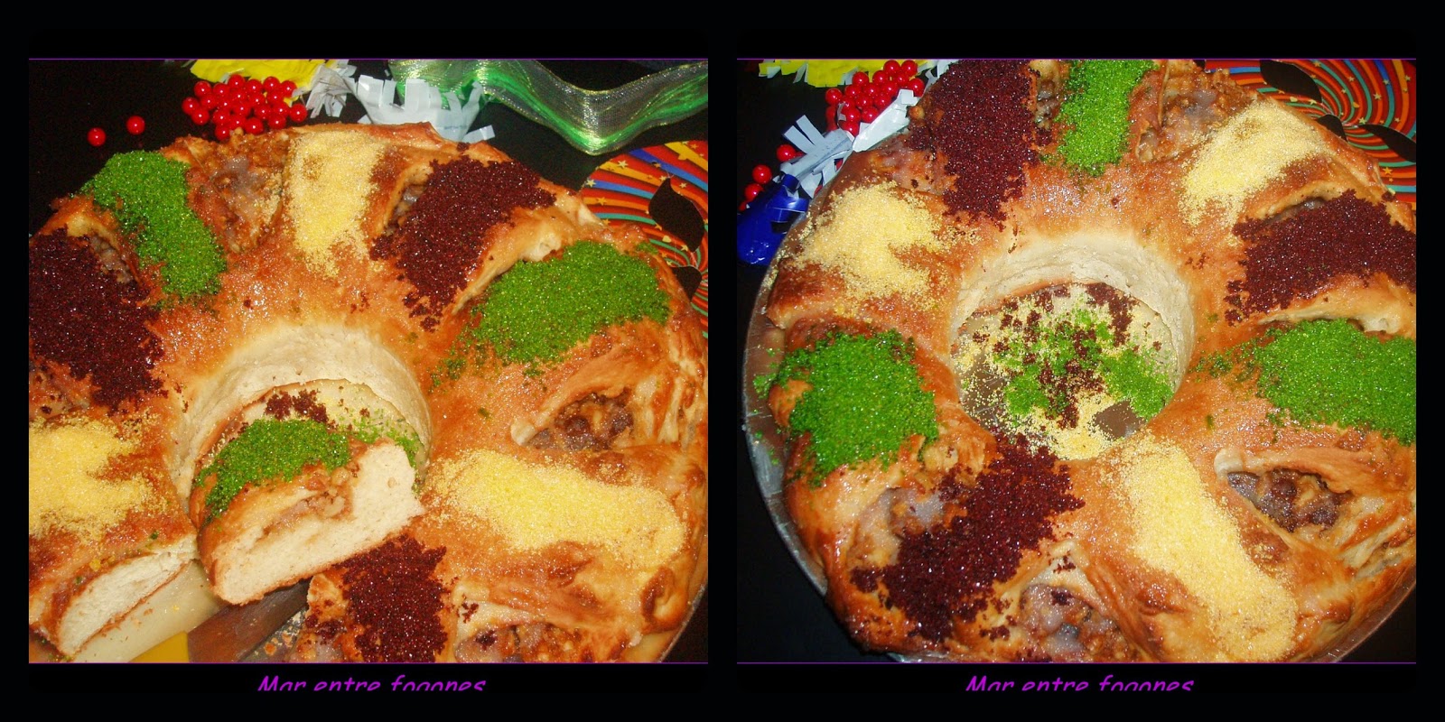 El dulce que teníamos que preparar era un KING CAKE. ¿Que no sabéis lo que es? Pero si es muy fácil, jajajaja... es un tipo de roscón de reyes pero con tres colores por encima de azúcar...Los colores tenían que estar si o si, no había manera de escaquearse... El significado de ellos son: