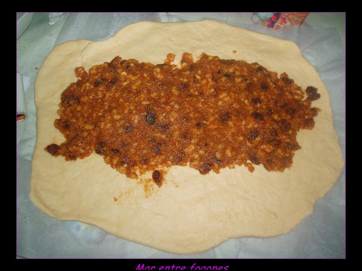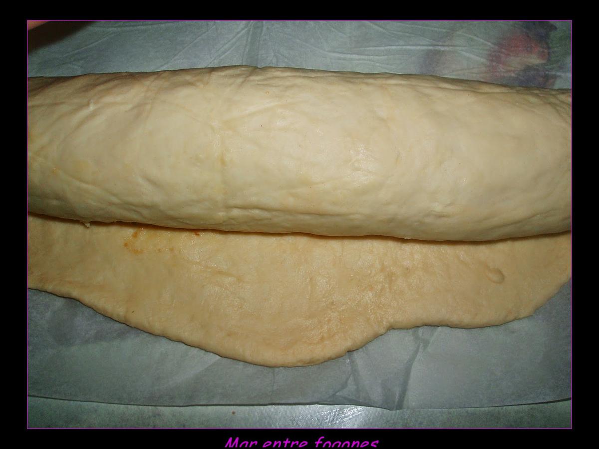Una vez haya fermentado la masa y haya aumentado de volumen volvemos a amasar ligeramente y la estiramos bien formando un gran rectángulo.