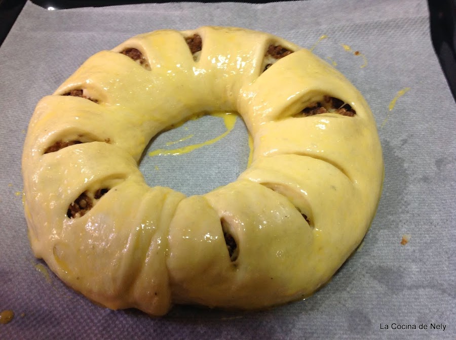 Separamos una yema de la clara ( guarda la clara) y la batimos con un poco de leche y pintamos el king.