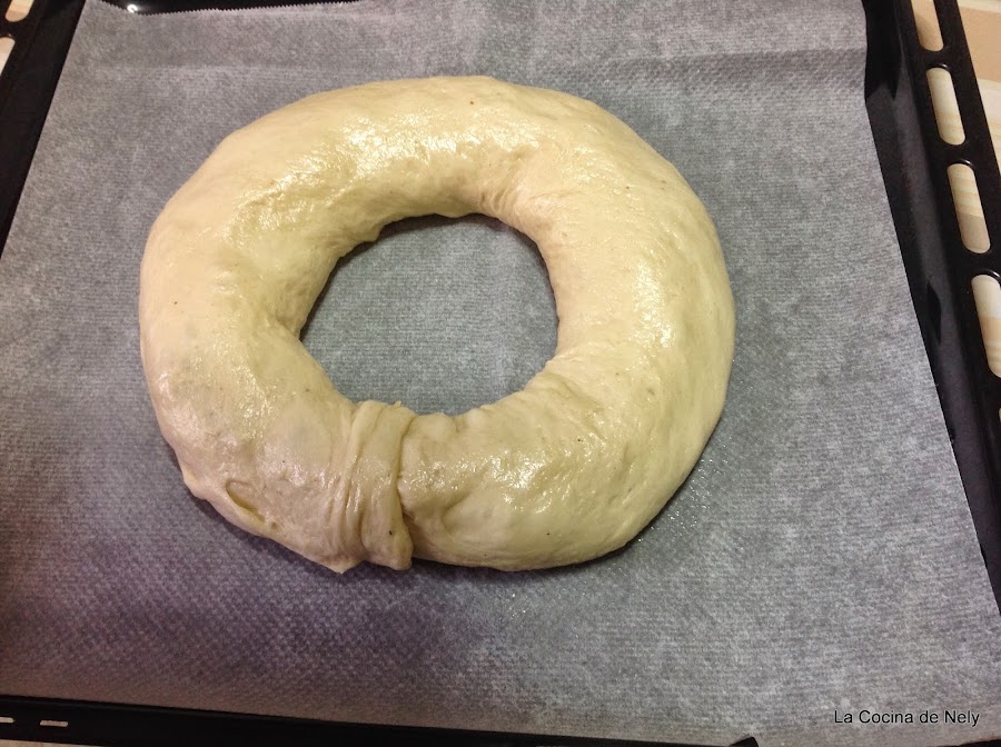 Ponemos un papel de horno en la bandeja y unimos los extremos hasta formar un circulo.