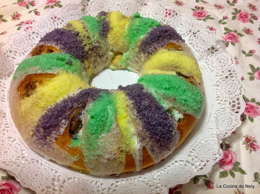 Este fantástico postre para mi hasta ahora desconocido totalmente, resulta que es tipico en Lousiana, allí es típico comer este rico postre el martes de carnaval,al igual que nosotros en el roncón de reyes escondemos una figura y un haba ellos esconden una figura de un bebe que simboliza al niño Jesus y quien lo encuentre sera coronado rey de la fiesta y organizara la fiesta el año siguiente.