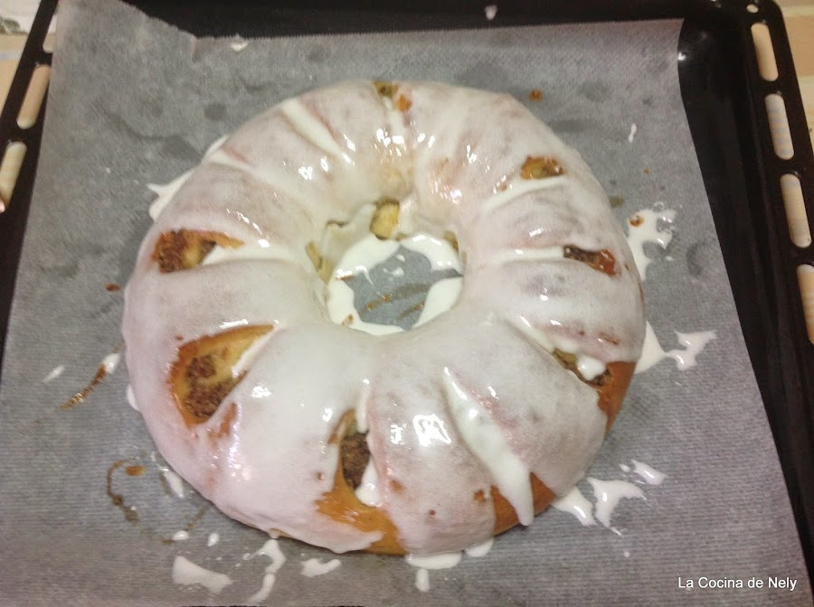 Para hacer el glaseado batimos la clara que tenemos reservada con los 150gr de azucar glas , hasta que quede blanco brillante y lo pintamos con ello, no escatimes esta rico.