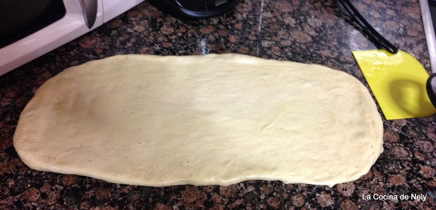 Una vez este fermentado untamos la encimera con aceite y ponemos la bola y hacemos un rectángulo como se ve en la imagen que sea finito .