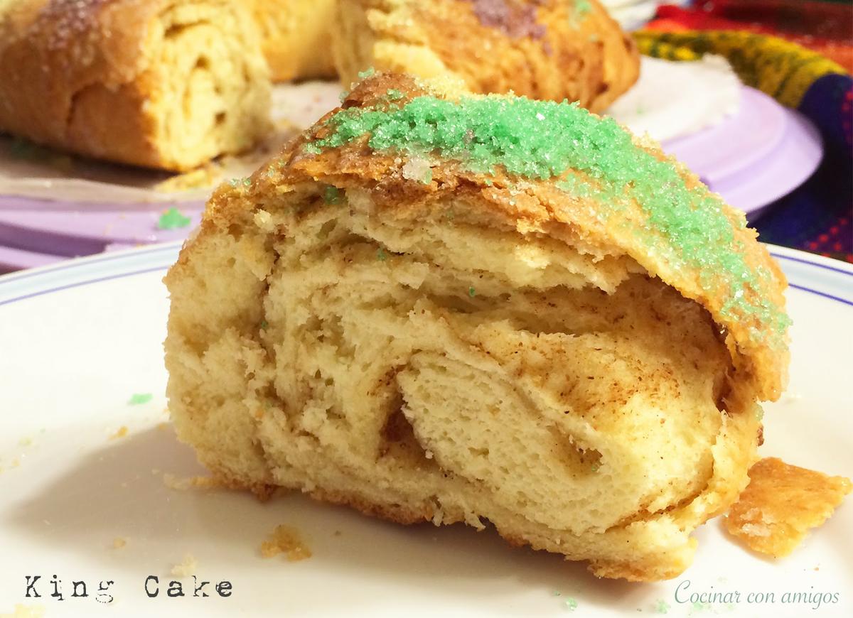 El king cake es un postre, similar al roscón de reyes tradicional español, que se prepara para celebrar el Mardi Gras en Nueva Orleans, Luisiana y Alabama. Su nombre se traduce como martes graso, aunque comúnmente se le llama martes de carnaval. El mardi gras se celebra antes del miércoles de ceniza y es el último día para disfrutar de los placeres (culinarios y carnales) antes de la época de abstinencia de la Semana Santa y la Cuaresma.También en el king cake se esconde una figura, en este caso un bebé de plástico que simboliza al niño Jesús, además sus 3 colores representan cada uno a un Rey Mago y simbolizan el amarillo el poder, el morado la justicia y el verde la fe.