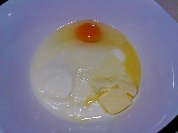 En un bol mezclamos el huevo con los yogures, la mantequilla fundida y el azúcar.