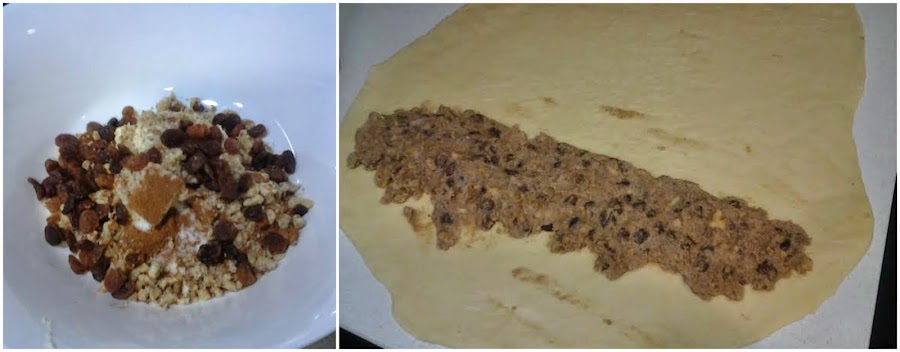 Una vez haya levado la masa, preparamos el relleno. Mezclamos en un bol la mantequilla en pomada con el azúcar, la canela, las pasas y las nueces picadas. Estiramos la masa formando un rectángulo y en un extremo colocamos el relleno.