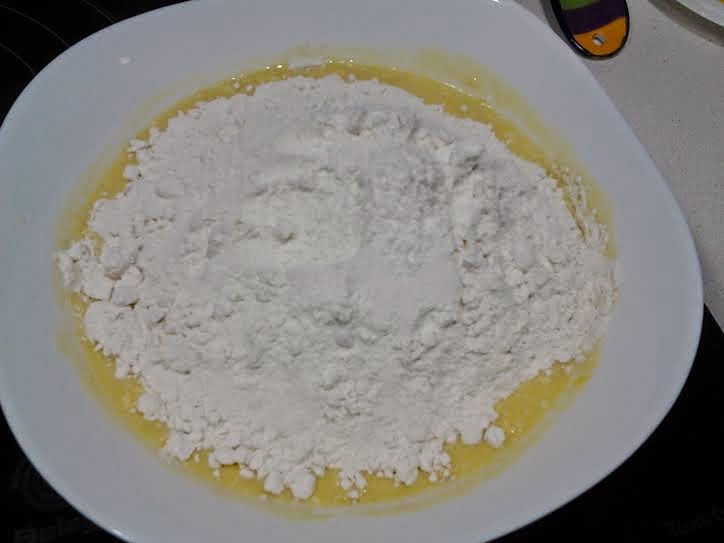 Mezclamos la harina con una pizca de sal, la vertemos al resto de los ingredientes y mezclamos bien hasta formar una masa homogénea.