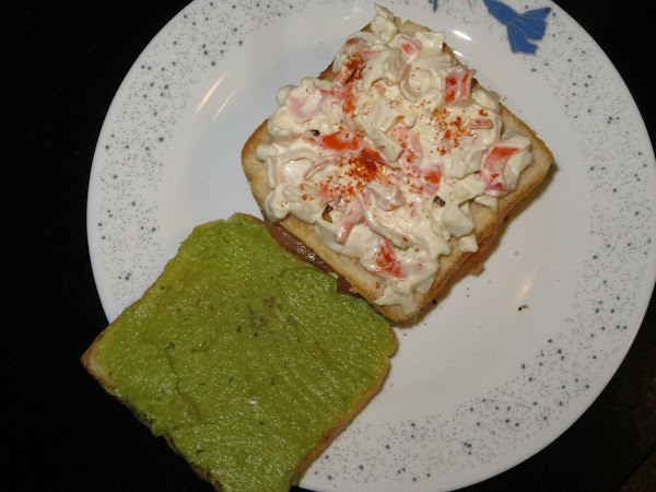Por otra parte, partimos en trozos pequeños los palitos de cangrejo y lo juntamos con las otras dos cucharadas de mayonesa y ahora llega el momento de montar nuestro sándwich. Cogemos una rebanada del pan tostado y untamos la salsa amostazada encima colocamos el tomate y la lechuga, colocamos otra rebanada de pan y echamos la mezcla de palitos de cangrejo, esparcimos un poco de paprika o pimentón por encima y en la rebanada que vamos a colocar encima untamos una capa generosa de guacamole. Cerramos nuestro sándwich lo partimos en cuatro trozos con la ayuda de unos palillos y lo acompañamos de patatas chips.