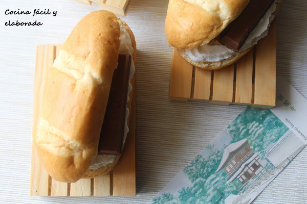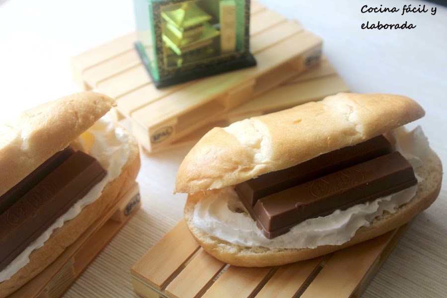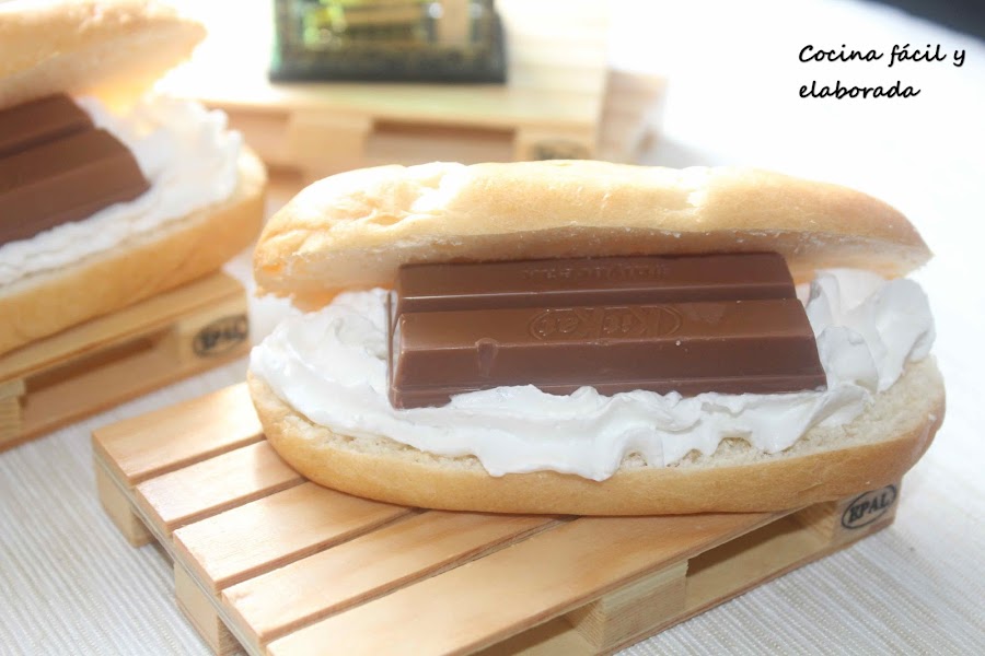 Es muy fácil de hacer, apenas 1 minuto por cada sandwich. Lo único que tenéis que hacer es cortar los panes de leche por la mitad (yo los compro en los supermercados, Día, Mercadona ó Carrefour, pero como ya sabéis que me gusta hacer recetas de todo tipo, os traeré más adelante la receta para que hagáis vuestro propio pan de leche). Rellenáis bien de nata montada (crema de leche) y ponéis el mini kit kat. Si os gusta la mermelada, antes de poner el mini kit kat , añadid una cucharadita de la que más os guste.