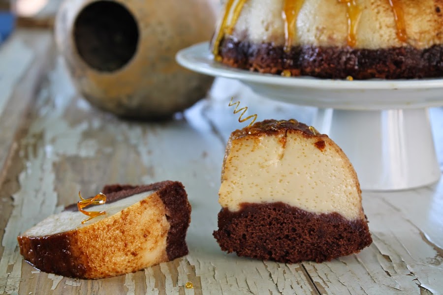 Bien, pues he llamado a este pastel así, tal y como yo lo conocí por primera vez en Bulgaria - el pastel árabe de bizcocho húmedo de cacao y crème caramel. Es un postre muy, muy fácil, delicioso y bastante sorprendente. Si es la primera vez que lo hacéis veréis que cada capa se coloca a la perfección por si misma. Yo lo he hecho en un molde metálico de Bundt cake. He probado en uno de silicona y no me gusto el resultado ya que al desmoldarlo había trozos pegados así que por lo que de mi depende os aconsejo con diferencia que uséis un molde metálico. Os dejo con la receta y al final os daré algún que otro truco para desmoldarlo mejor.