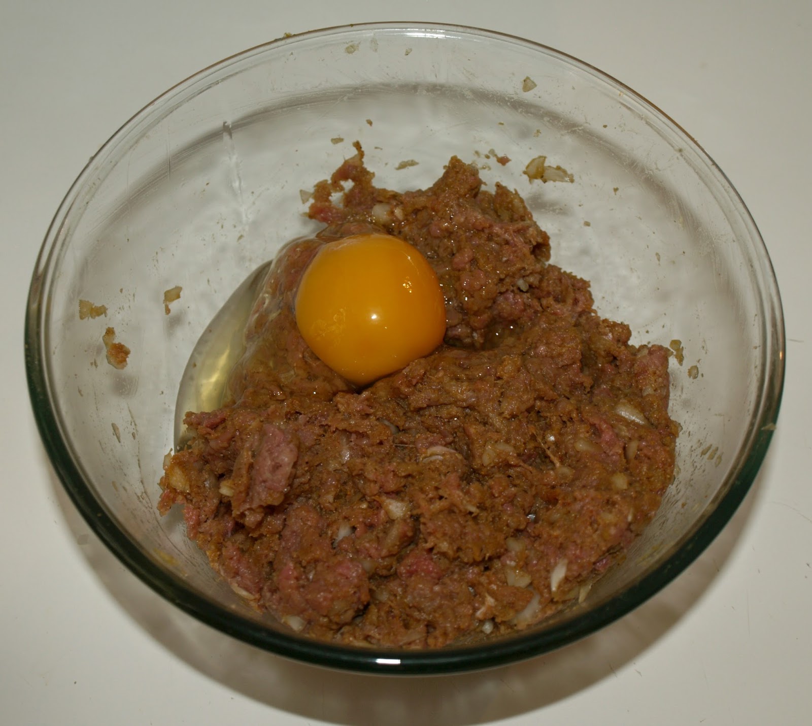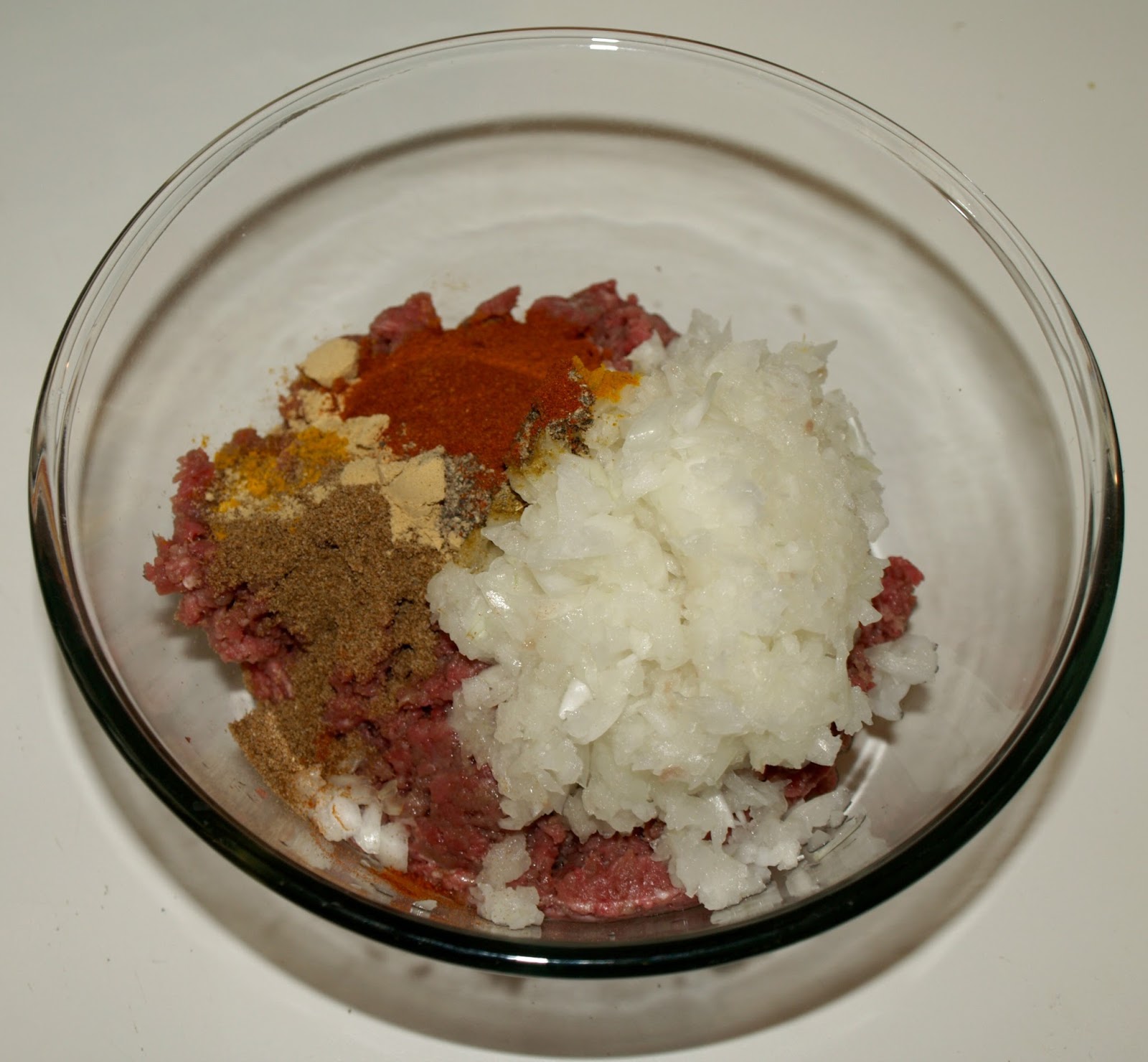 - A continuación picamos la cebolla y la colocamos junto con la carne en un bol con la sal y las especias. Mezclamos bien.