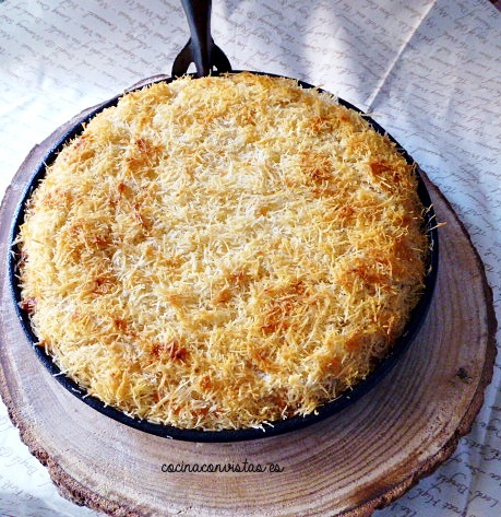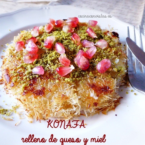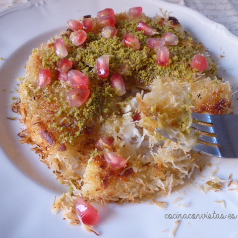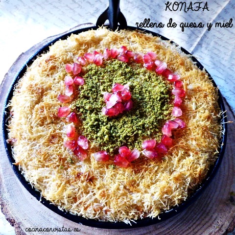 Podemos hacerlo al fuego, para ello colocamos la sartén sobre el fuego y transcurridos unos 5 minutos damos la vuelta (como si fuera una tortilla) a nuestra Konafa para que se dore por el otro lado. Una vez dorada, la regamos con el jarabe y la pasamos al plato para adornar y servir.