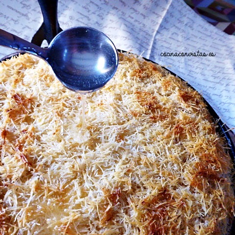 Sacar del horno y verter el jarabe por encima de toda la Konafa.