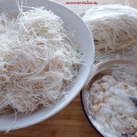 Trituramos el Kataif con las manos, que nos quede como si fueran fideos para una sopa.