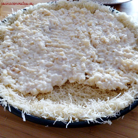 presionando sobre el fondo y los laterales, sobre esto colocamos la mezcla de quesos y miel
