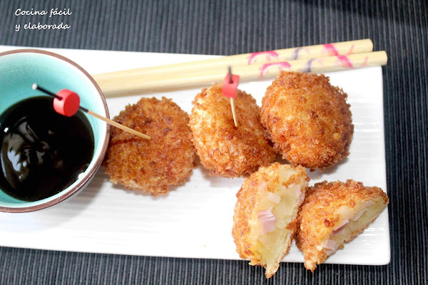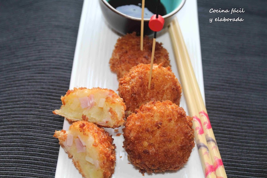 Hoy tenemos nueva receta japonesa, korokke, que es la croqueta japonesa. El nombre suena incluso parecido, viene de la palabra francesa croquette. Es muy fácil de hacer, se cuecen patatas, se le añade un sofrito de cebolla y carne, se mezcla todo y se pasa por harina,huevo y panko. Se fríe y se sirve con salsa tonkatsu. Esta es la receta tradicional-que haremos otro día-, hoy os dejo una variante que he hecho, poniendo jamón york y queso parmesano. Probad, os vais a enganchar a esta forma de comer croquetas, es adictiva, jeje. El sabor del panko en los rebozados es increíble. La salsa tonkatsu se puede comprar en cualquier supermercado asiático, pero tranquilos que más adelante vamos a aprender nosotros a prepararla.