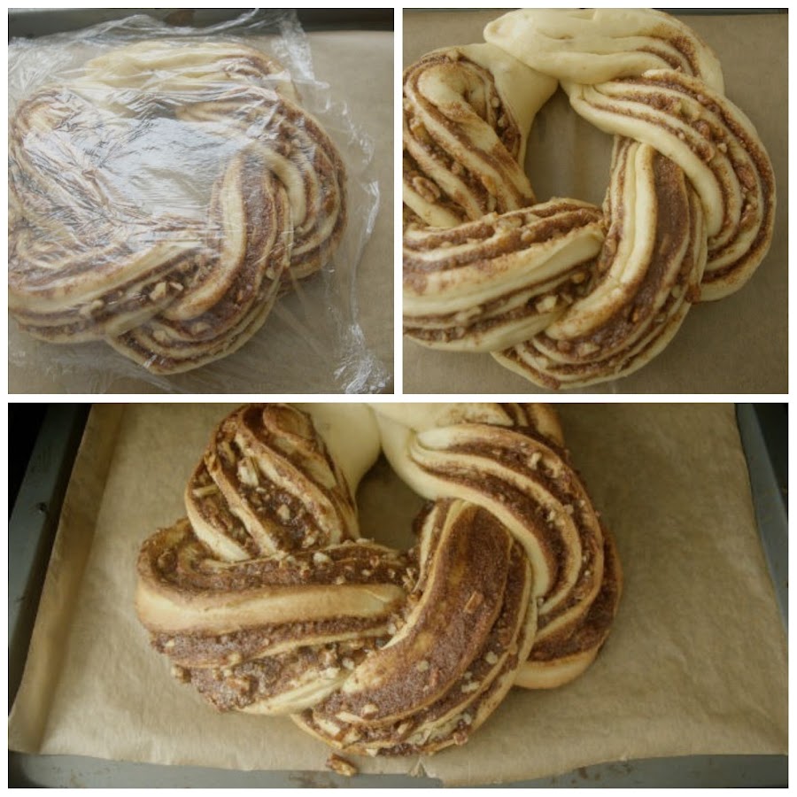 Place the kringle in a baking tray covered with some parchment paper. Cover with some plastic wrap. Cover with a cloth and let rise for 1 hour.