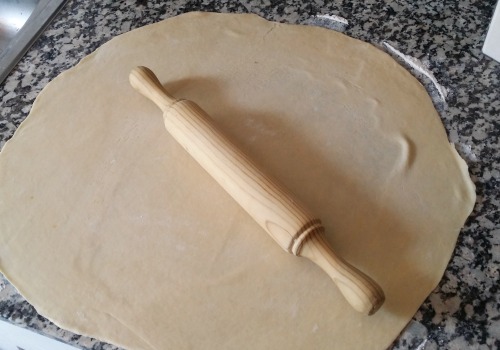 Extiende la masa con un rodillo sobre una superficie ligeramente enharinada, hasta que te quede un rectángulo de aproximadamente 40X50 cm.